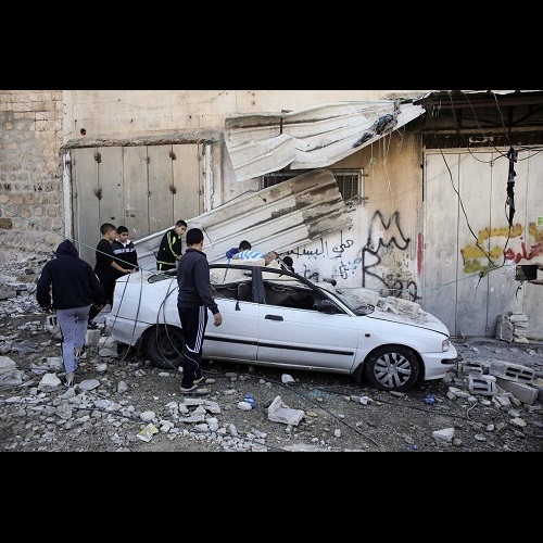 Palestinians stand next to a car damaged during the demolition of Abdel-Rahman Shaloudi`s home in the East Jerusalem neighbourhood of Silwan November 19, 2014. Israel on Wednesday destroyed the home of a Palestinian, Shaloudi, who last month ran over and killed two people at a Jerusalem tram stop, a day after two militants killed four rabbis and a policeman at a synagogue in the city. Reuters